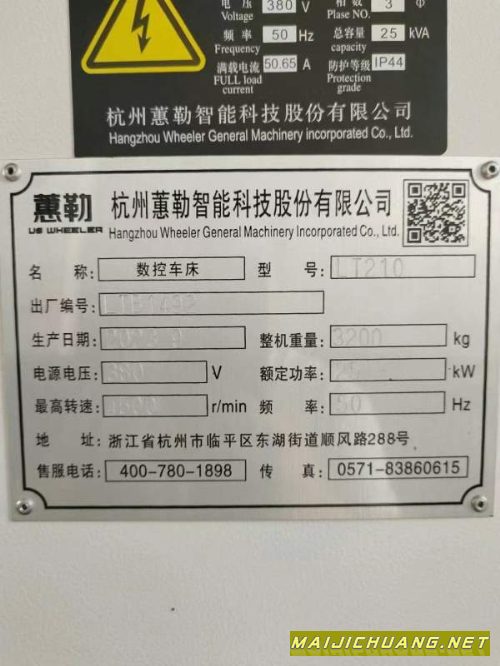刚刚到货2023年9月出厂杭州惠勒LT-210,8寸卡盘主轴电机11/15KW,回转直径510车削直径320,加工长度525,12工位伺服刀塔,带尾座,后置排屑机